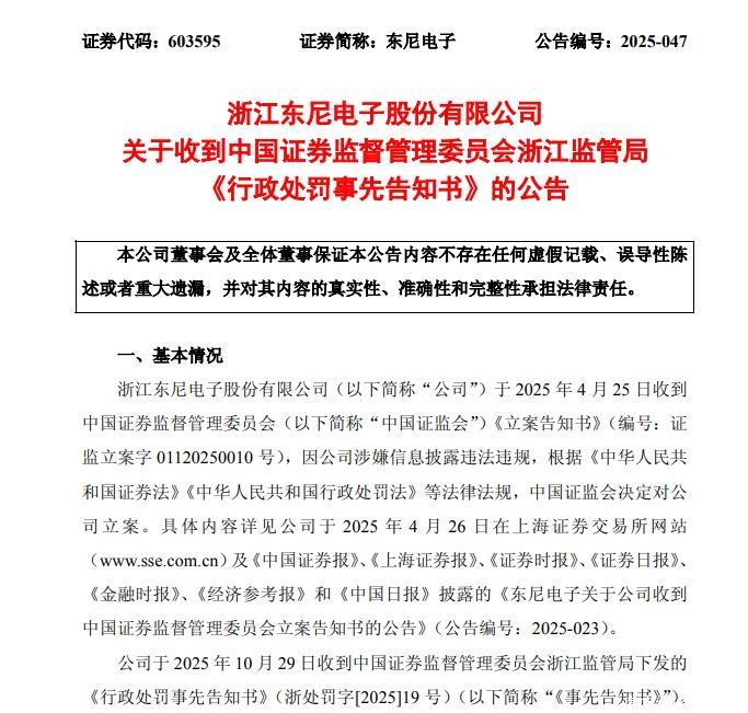 10月30日,东尼电子(ST东尼,603595.SH)公告称,公司于2025年10月29日收到中国证券监督管理委员会浙江证监局下发的《行政处罚事先告知书》(以下简称“《告知书》”)。