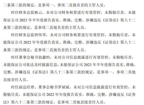 《告知书》称,东尼电子时任董事长沈新芳、时任总经理沈晓宇、时任财务总监杨云和钟伟琴、时任董秘翁鑫怡和时任副总经理、董秘罗斌斌均是事项一和/或事项二的直接责任人员。